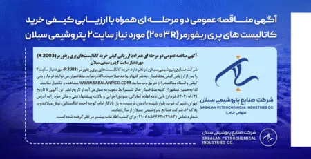 آگهی مناقصه عمومی دو مرحله ای همراه با ارزیابی کیفی خرید کاتالیست های پری ریفورمر(R 2003) مورد نیاز سایت2 پتروشیمی سبلان